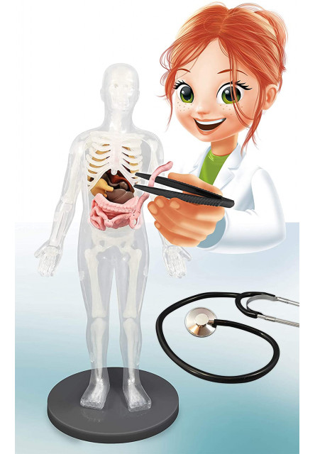 Az emberi testmodell szétszedhető, és csipesszel ki lehet venni az egyes szerveket, amelyek puha anyagból készültek, és élethű színekkel és formákkal rendelkeznek. Van hozzá állvány és éjszaka világító csontváz is. A készlet tartalmaz egy funkcionális baba-sztetoszkópot is (fém/műanyag), amellyel a szívverést lehet hallgatni.