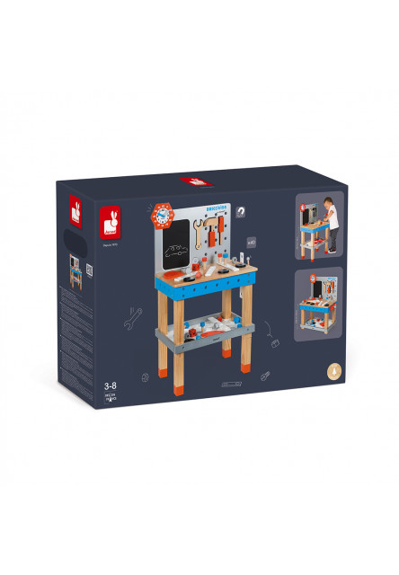 Ez a 3 évesnél idősebb gyermekek utánzó játéka valóban nagyon komplett, hogy a kicsik szakértő ezermesterként képzelhessék el magukat, és a legapróbb részletekben is reprodukálják a memorizált gesztusokat! Elképzeljük az alkotásokat, és fejlesztjük ügyességüket számos kiegészítővel, kék, narancs és ezüst tónusban. A munkalap és a lábak természetes fából vannak, hogy megtalálják az autentikus szempontokat. Az egyedülálló állítható magasságú lábrendszerrel ez a barkácsolási játék méretezhető és a gyermekével együtt növekszik, tökéletesen alkalmazkodva méretéhez (a munkalap maximális magassága: 50,5 cm). Azoknak a kicsiknek, akik szeretnek szerveződni, az okos rendszer a mágneses szerszámok mindig a megfelelő helyen tartják a szerszámokat. A második tálca polcként szolgál, és más tárolási lehetőségeket kínál. A munkalapon sok lyuk teszi lehetővé a barkácsolás szerelmeseinek, hogy tetszés szerint csavarjanak, szereljenek és alkossanak. Akár egy satut is használhat, amely a munkaasztal jobb oldalán található! Ez a teljes játék számos kiegészítővel tökéletesen felszerelt, hogy a gyermek fantáziája szerint végtelenül összeszerelhető és szétszerelhető tárgyakat hozzon létre! 3 mágneses szerszám és 40 kiegészítő (csavarok, anyák, csavarok, alátétek, lemezek stb.), Egy satu, egy óra, amellyel szórakozhatunk az idővel, egy tábla gyönyörű krétadiagramok készítéséhez és egy lepedő egy versenyautó összerakásához !