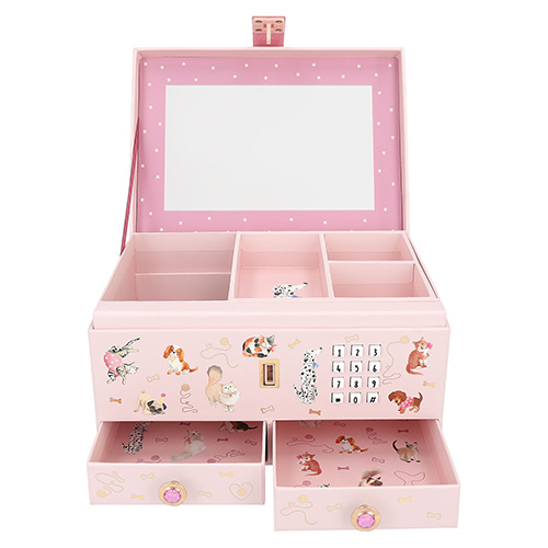Kiváló minőségű Top Model lány ékszerdoboz erős kartonból, tükörrel és elektronikus zárral. Amikor kinyitod, egy titkos kód egy dallamot játszik. az ékszerdoboz nagy belső teret kínál, hogy rendezetten tárolhasd az összes ékszeredet! A felső emeletet egy kivehető rekesz osztja el a gyűrűk és fülbevalók tárolására. Az alsó belső fiókok tökéletesek a kisebb ékszerek számára. A népszerű dizájn minden lánynak örömet okoz!Elemek: 3 x LR44/AG13 (tartozék).Méretek: 12,3 x 20 x 14,3 cm.