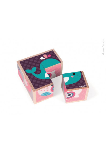 A készlet 4 db fakockából áll. A készlet lehetővé teszi 6 különböző kép elrendezését állatfigurákkal: sündisznó, pingvin, bálna, bagoly, madár és szitakötő. Ez a tökéletes kirakós játék kisgyermekek számára, hogy a kirakós játékkal kezdjék kalandjukat. A téglákat Franciaországban tervezték.