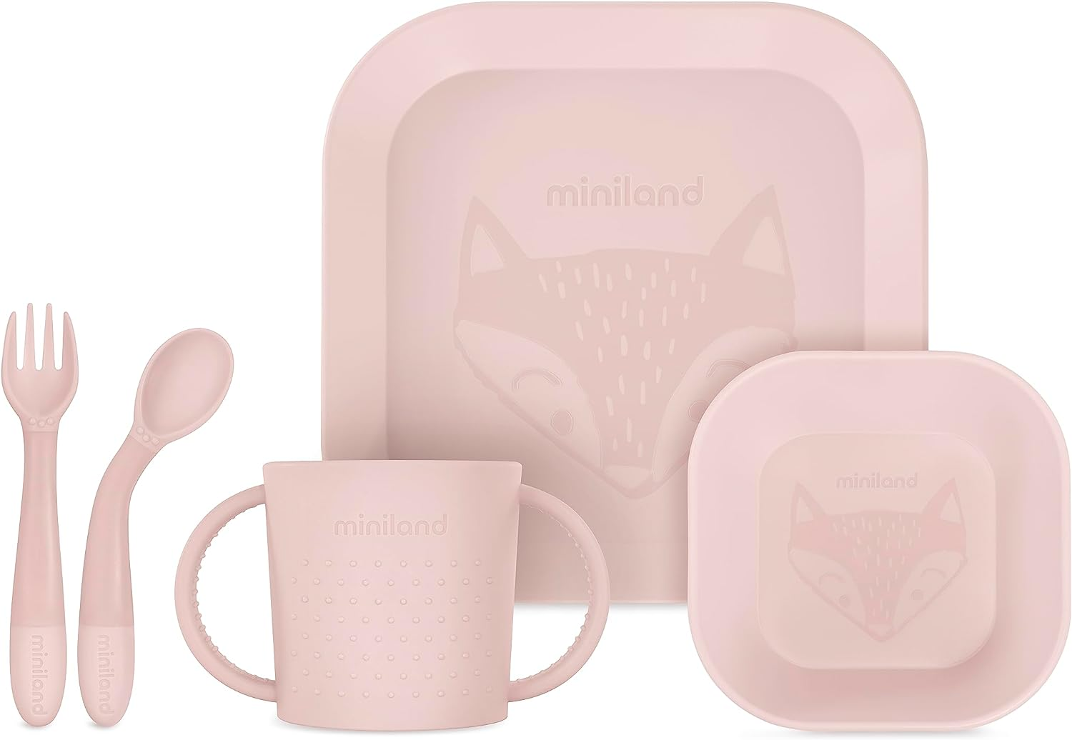 Az étkészlet egy tányérból, egy tálból, egy 2 fogantyús bögréből, egy hajlékony kanálból és egy villából áll. Mind a tányér, mind a magas peremű tál segíti az ételek könnyű kanalazását. A kanál és a villa rugalmas, kellemes anyagból készült, és csúszásmentes, kerek fogantyúval rendelkezik, amely megkönnyíti a baba számára a fogást. A kétfülű pohár segít a babának megtanulni a klasszikus bögréből inni.