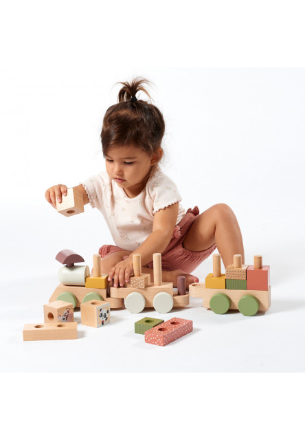 A gyönyörű fa vonat színes motívumokkal és állatok képeivel van nyomtatva. A különböző formájú és színű blokkokból gyermeke a kocsik különböző variációit állíthatja össze.