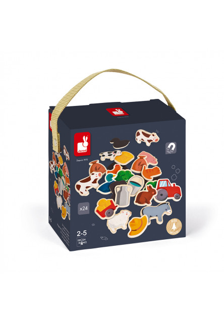 Fedezd fel a farm állatait és eszközeit!24db-os fából készült mágneses formák, melyek hűtőre vagy a gyermek környezetében bármely mágnes részre felhelyezhetőek. A játék tökéletesen alkalmas a farm világának élvezetes felfedezésére. Rétegelt lemezből, szupertartós anyagokból készült megnyugtatóan biztonságos fajáték. A mérete kismértékben eltérő lehet: 7,5×6 cm. A játékos pillanatokat hasznossá tevő francia Janod cég alapelve; a gyermekek fejlődésének elősegítése.