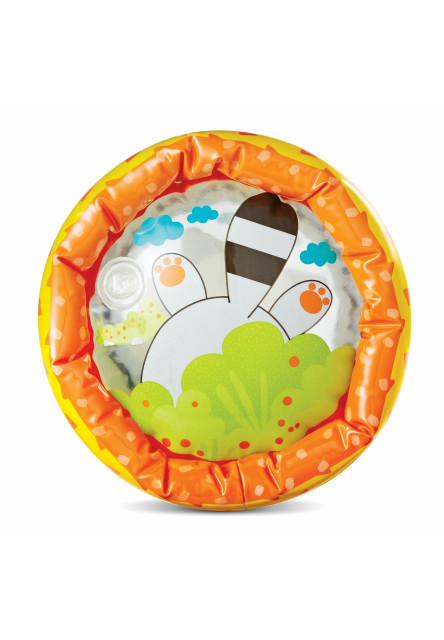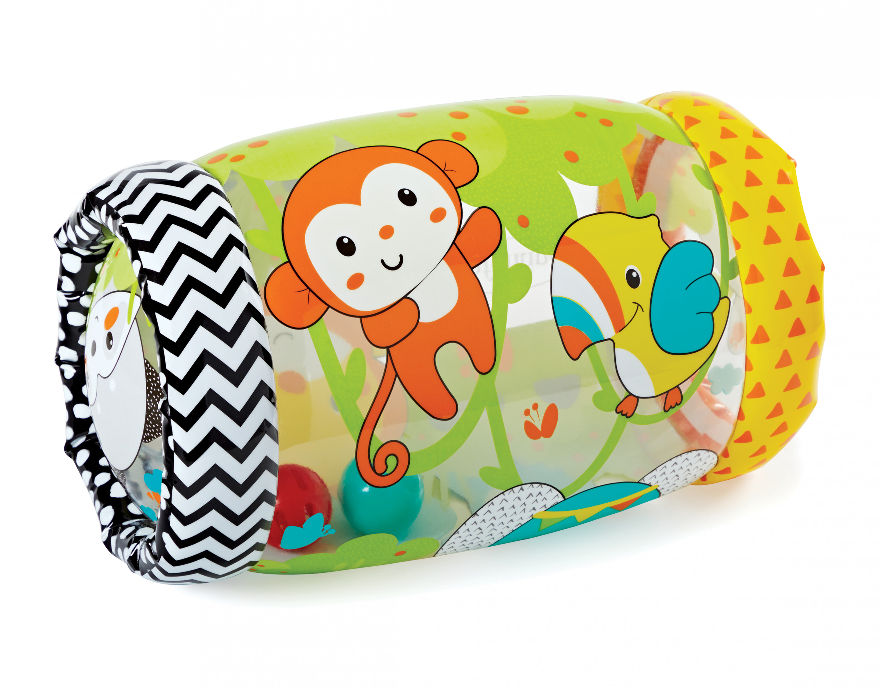 A felfújható, rendkívül könnyű görgő mozgásra ösztönzi a gyermeket, mászásra, ülésre és az első lépések megtételére csábítja. A henger belsejében lévő csilingelő csengők és a színes állatokat ábrázoló színes képekkel ellátott merész nyomtatás egyaránt felkelti a gyermek figyelmét.
