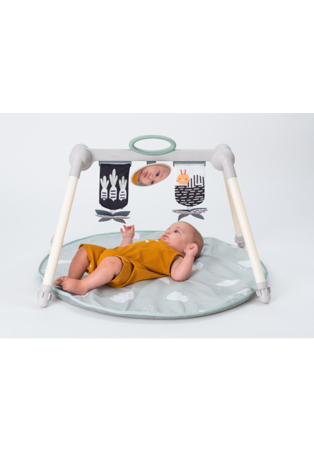 A stílusos, puhán párnázott játéktakaró a felfedezéshez és felfedezéshez szükséges különféle tevékenységekkel a gyermek fejlődésének két korosztályához készült, a születéstől kezdve.