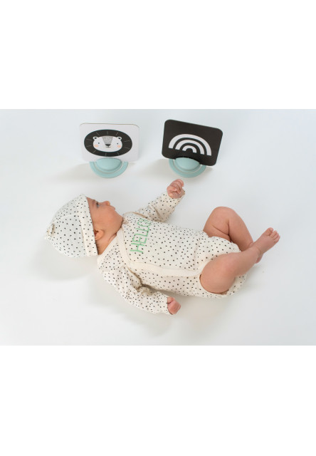 A két festőállványt tartalmazó egyedi képkészlet szórakoztatja gyermekét, miközben segít a látás és a finommotorika fejlesztésében már születésétől kezdve. A festőállványoknak köszönhetően a képek a baba elé, hasi helyzetben is elhelyezhetők. A készlet által kínált képek sokasága lehetővé teszi a szülők számára, hogy a képeket cserélgessék, és tovább tartsák fenn a baba figyelmét.