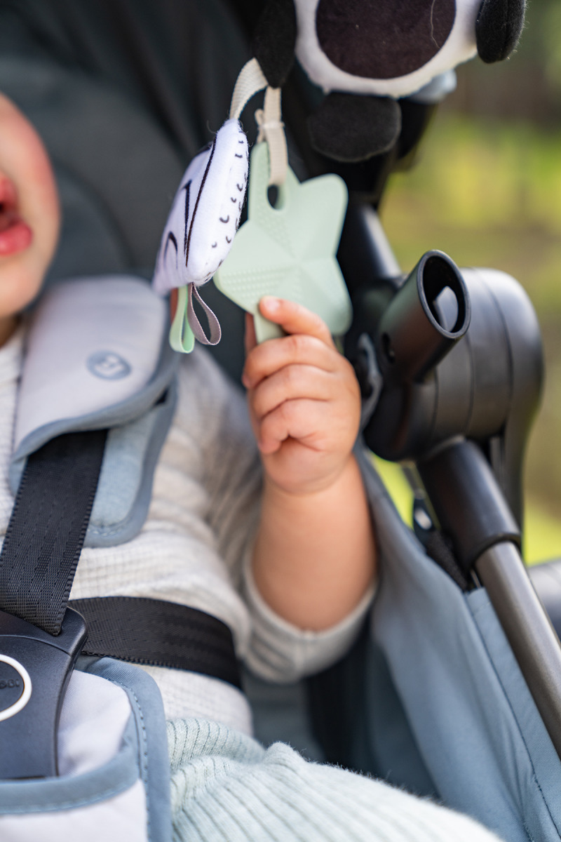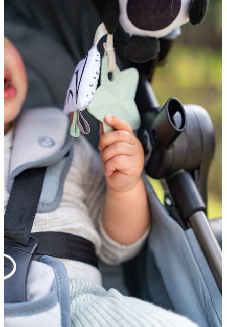 Az imádnivaló panda formájú puha játék gyengéden zörög, amikor mozog. A játék különböző textúrái felfedezésre csábítják a babát. A gyűrűnek köszönhetően könnyen felakasztható az autósülésre, babakocsira vagy kiságyra.