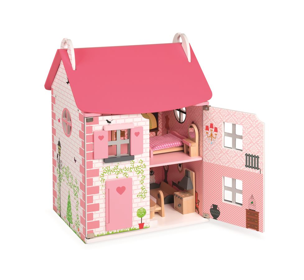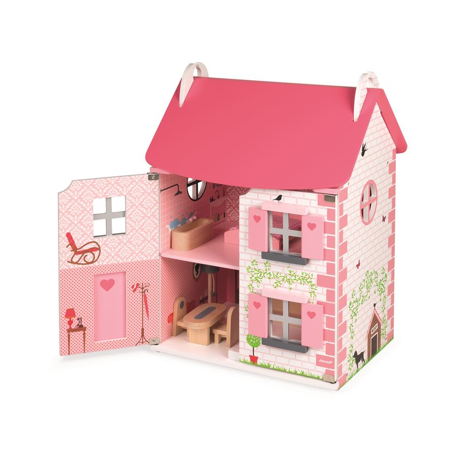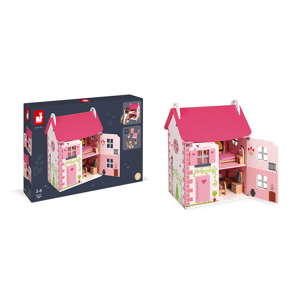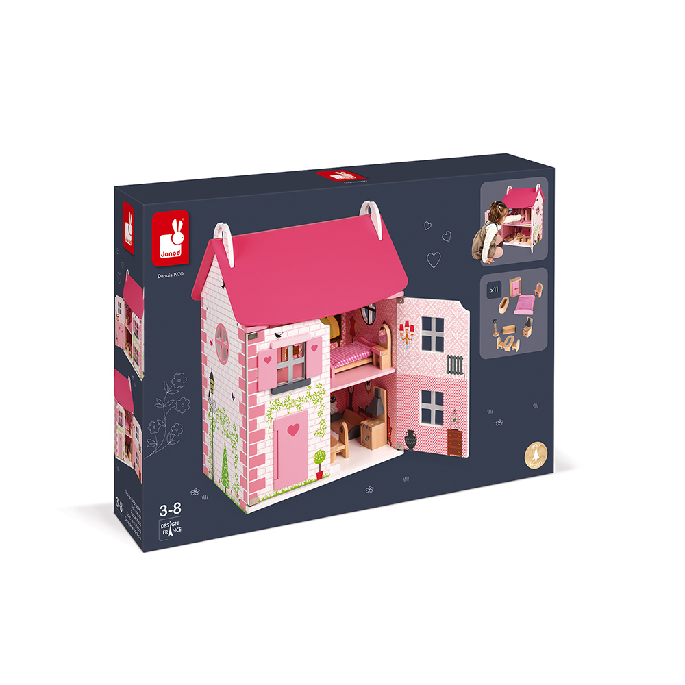 Ez egy gyönyörű babaház, három emeletes, szépen berendezett a megfelelő bútorokkal. Nyissa ki a ház ajtaját a játékhoz, és zárja be őket, hogy mindent tárolhasson benne, és könnyebben hordozhassa. Szép rózsaszín tégla, szív, pillangók és kis fák, ennek a háznak a dekorációja tele van szépséggel! Gyakorlati szempontból az ajtók mágnesesek és a ház tető is kinyílik, hogy jobban hozzáférhessenek a különböző helyiségekhez. A ház kompatibilis a kb. 11,5 cm méretű babákhoz. Ebben a házban a gyerekek 11 kiegészítővel játszhatnak, hogy fejlődjenek, amire vágynak: szekrény nyitott ajtókkal, ágy fedéllel, fésülködő asztal, fürdőkád, kanapé, lámpa, asztal, 2 szék, konyha. Az összerelése nagyon könnyű.