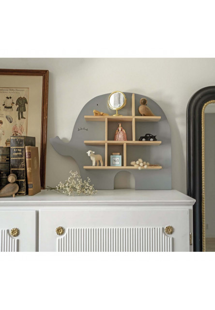 Aranyos és hasznos elefánt alakú fali polc. A polc különböző méretű válaszfalakkal van ellátva, amelyekben tárolhatóak gyermeke legkedveltebb dolgai. Ez a polc garantáltan a gyerekszoba kedvenc dísze lesz. Anyag: fa Méretek: 55 x 9 x 45 cm