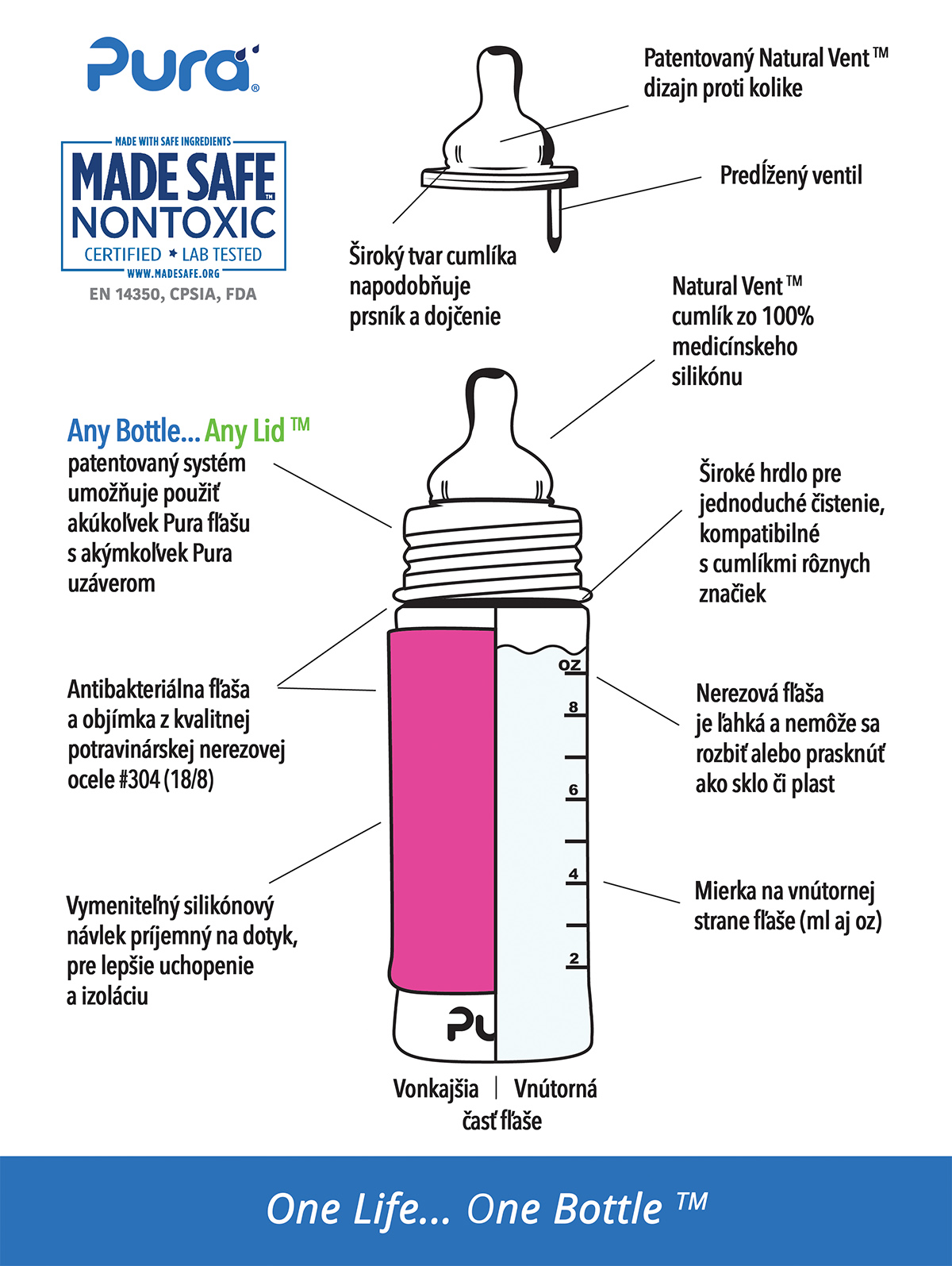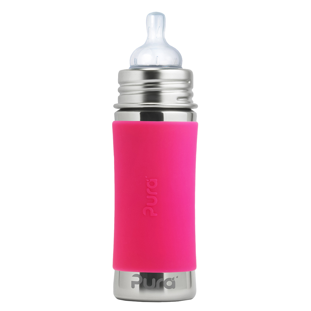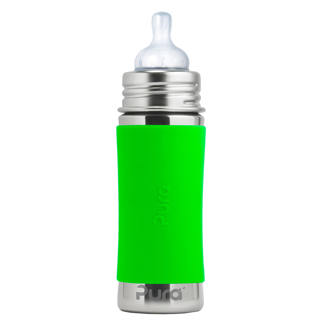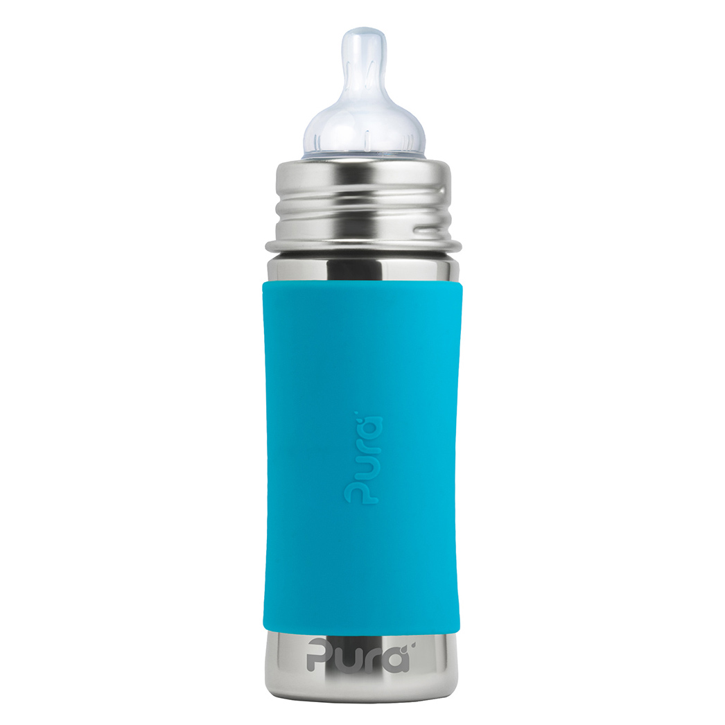 Végre egy biztonságos kulacs 100%-ban műanyag részek használata nélkül. A Pura kulacsokkal biztos lehet abban, hogy a belsejéből nem szabadulnak fel káros anyagok, ízek és szagok, így az nem szennyezi a benne levő italt, mint a műanyag kupakkal rendelkező műanyag kulacsoknál. Semmi sem fontosabb az Ön gyermeke egészségénél. A Pura kulacsok alkalmazkodnak és “nőnek” az Ön gyermekével. A lezárók egyszerű cseréjével az kulacs cumisüvegből csőrös-, szívószálas vagy sport lezárású kulaccsá válik, valamint hasznát veheti pohárként, vagy etetésnél is. Így az kulacsot évekig használhatja. One Life… One Bottle TM A legbiztonságosabb, leguniverzálisabb, könnyű, törhetetlen környezetbarát kulacs több, mint 35 értékeléssel. Az első kulacs a piacon, amely 100%-ban műanyag felhasználása nélkül készült, és az egyetlen, amely elnyerte a NonToxic Certified tanusítványt. Baby Grows… Bottle Evolves TM – szabadalmazott rendszer lehetővé teszi bármilyen Pura kulacs bármelyik Pura lezáróval való használatát. A lezárók egyszerű cseréjével az kulacs cumisüvegből csőrös-, szívószálas vagy sport lezárású kulaccsá válik, valamint hasznát veheti pohárként, vagy etetésnél is. Egy kulacsot így évekig is használhat, ezzel pénzt spórolva, valamint védve a környezetet. Az kulacs és a foglalat antibakteriális rozsdamentes acélból készült #304 (18/8), a többi része pedig a legmagasabb minőségű orvosi szilikonból. Nem tartalmaz BPA-t, PVC-t, ftalátokat és más káros anyagokat és toxint, az EU szabvány szerint tesztelve. Az orvosi minőségű szilikonból készült Pura Natural Vent Nipple™ kólika elleni cumi középátfolyással rendelkezik. A kulacs kompatibilis a legtöbb cumimárkával. A belső oldalán skála található a pontos és kényelmes adagolásért Tartozik hozzá szilikon tető, ami védi a cumit, valamint cserélhető, színes szilikon kulacstartó a jobb fogás és szigetelés érdekében. Mosogatógépben tisztítható. Élethosszig tartó jótállás a rozsdamentes acél részekre. Ez nem vonatkozik az kulacs mechanikai sérüléseire.Teljes űrtartalom: 325ml Jelölt űrtartalom: 275 ml Súly: 172g Méretek: 5,7 x 19,7cm Csomagolás tartalma: rozsdamentes acél kulacs 325ml, rozsdamentes acél foglalat, kólika elleni cumi Pura Natural Vent Nipple™ (középátfolyás), szilikon tartó és kupak