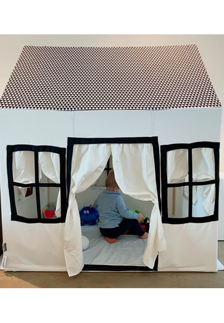 A játszóház masszív faszerkezetből áll, szövet falakkal és tetővel, az ablakok és ajtók függönyökkel vannak ellátva.