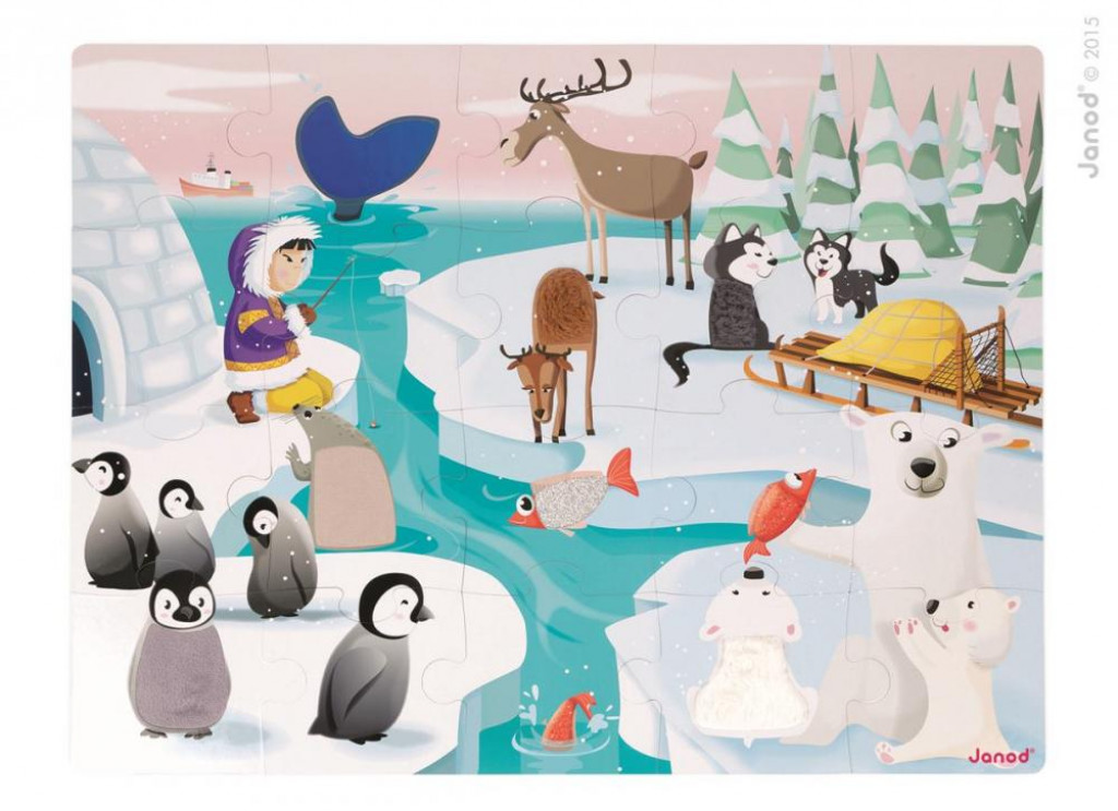 Eredeti Élet a jégen tapintós puzzle, amely elkalauzolja Önt és gyermekeit a sarkvidéki állatok jeges világába. Minden egyes darab kirakásával gyermekei újat tanulnak a sarkvidéki állatokról nem csak vizuális formában, hanem a speciális felületének köszönhetően tapintással is! A puzzle fejleszti a logikai gondolkodást, a figyelmet, memóriát, képzelőerőt, segíti a színek, formák és méretek megkülönböztetésének tanulását. A gyermekek megtanulják érzékelni a részek és az egész közti kapcsolatot, valamint kiválóan fejleszti a kéz motorikáját is. A puzzle 20 db karton puzzle-t tartalmaz, 3 éves kortól ajánlott. Puzzle mérete 65 x 50 cm