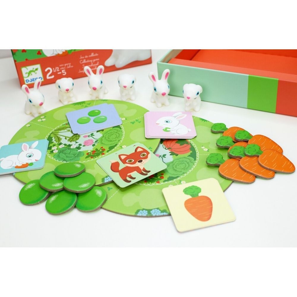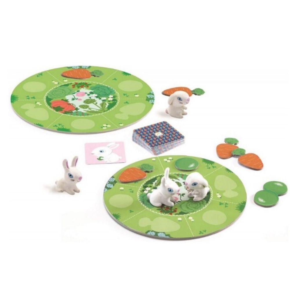 Nyuszi ül a fűben társasjáték a gyermek által kihúzott kártyalapokon egy-egy rajzos utasítás található, mit tegyen a gyermek a játékmezőre, répát, borsót, vagy nyuszit. Ám ha a róka lapja kerül sorra elviheti a nyuszit! Mindenből 3-t kell gyűjteni a győzelemhez. Rókából csak egy van, de az nem a kis képeken egyikén található, hanem a kártyalapok között várja, hogy előbújhasson. Egyszerű szabályú társasjáték, a figyelem, szabálytudat és a számlálás fejlesztésére találták ki, de legfőképpen a gyerekek örömére. A játék leírása: Ajánlott életkor: 2,5-5 év Játékosok száma: 2 játékos Játékidő: 10 perc A kis nyuszik nagyon mohók és ha szeretnél közelebb kerülni hozzájuk jobb, ha van a tarisznyádban néhány répa, vagy pár szem borsó. De vigyázz, mert a róka épp errefelé portyázik! A doboz tartalma: 2 kör alaplap, 22 kártya, 6 nyuszi, 6 borsószem, 6 répa Előkészületek: Mindkét játékos vegyen magához egy kör alakú alaplapot (kertet) és tegye maga elé. Keverjétek meg a kártyákat és tegyétek magatok közé egy pakliba lefelé fordítva. Tegyétek a borsókat, a répákat és a 6 nyuszit a húzópakli mellé. Játék menete: A legfiatalabb játékos kezd, majd egymás után következtek. Ha rád kerül a sor, húzz egy kártyát a pakliból és vidd véghez a megfelelő akciót az alábbiak szerint: Ügyesen szüreteltél! Vegyél el egy répát és tedd a kertedbe. Ha már van 3 répád, akkor sajnos nem maradt több hely, nem történik semmi sem. Ügyesen szüreteltél! Vegyél el egy borsót és tedd a kertedbe. Ha már van 3 borsód, akkor sajnos nem maradt több hely, nem történik semmi sem. Fincsi a répa! Ha van legalább 1 répád a kertedben, akkor vegyél magadhoz egy nyuszit és helyezd a kertedbe. Ha nincs répád, akkor sajnos semmi sem történik. Fincsi a borsó! Ha van legalább 1 borsód a kertedben, akkor vegyél magadhoz egy nyuszit és helyezd a kertedbe. Ha nincs borsód, akkor sajnos semmi sem történik. Légy óvatos, mert errefelé ólálkodik a róka! Tegyél vissza egy nyuszit a kertedből az asztal közepére. Ha nincs nyuszid, akkor semmi sem történik. Ezután a másik játékoson a sor, hogy felfordítson egy lapot a húzópakli tetejéről Játék vége: Akkor nyered meg a játékot, ha elsőként gyűjtesz a kertedbe 3 nyulat, 3 répát és 3 borsót.