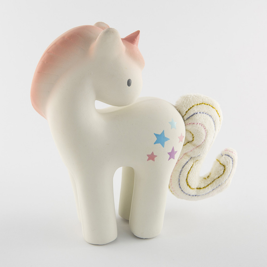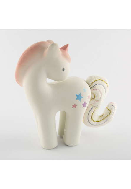 Ez a kedves Tikiri egyszarvú kellemesen, puha, természetes gumiból készültek, amely a Hevea gumifából származik. A gyerekek szeretik a természetes gumi sajátos, kellemes illatát és az ízét, és a csörgő hangja is érdekli őket. Rágókának is lehet használni. A puha, minősített pamutból készült susogó farok több érzékszerv stimulálását biztosítja. A lágyabb és keményebb részek és kiemelkedések masszírozzák a baba ínyét, és megkönnyebbülést és kényelmet nyújtanak.