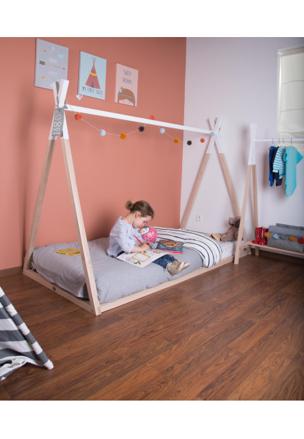 Az alvás még soha nem volt ilyen szórakoztató! Ez a vagány tipi ágy kiegészíti a junior szobát. Díszítsd a stílusos A-keretet fényekkel, girlandokkal vagy egyéb szórakoztató kiegészítőkkel, hogy még személyesebbé tedd gyermeked alvóhelyét. A tipi ágyat valódi sátorrá is átalakíthatod a rendelkezésre álló opcionális fedélnek köszönhetően. Így a kis kalandorod biztonságosan fekhet a saját szafari sátrában. Az ágykeret tömör fából készült. Továbbá ocionálisan rendelkezésre áll egy lécezett alap is. Az ágykeret közvetlenül a padlóra kerül, és nem helyezhető el junior ágyon vagy kisgyermekágyon.