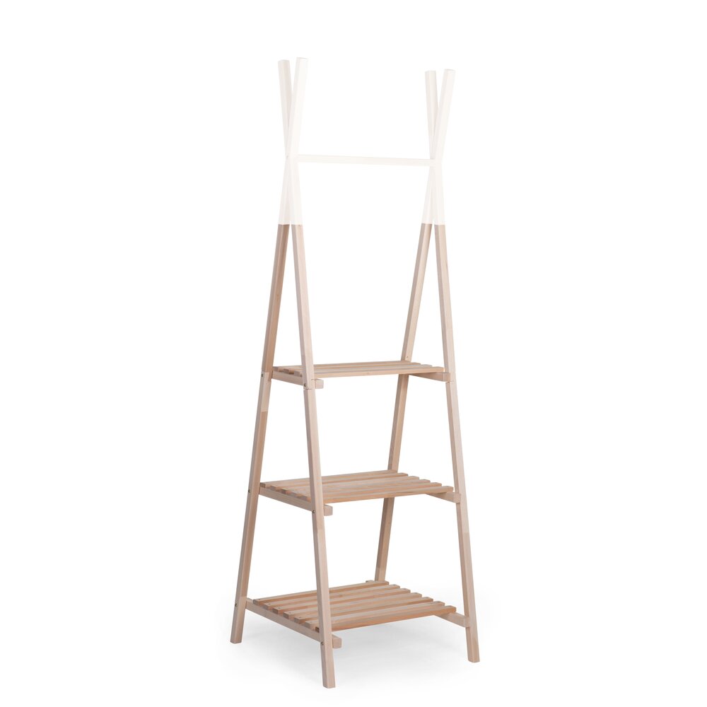 Ez a nagy, stílusos ruhatartó ideális a kis kalandorok számára. Az állvány 3 polccal és a tetején egy akasztórúddal rendelkezik, így könnyedén rendezheted a gyerekek ruháit. A tipi ruhatartó állványra természetesen néhány szép tárolókosarat vagy más tündéri dekorációs tárgyat is elhelyezhetsz. A ruhatartó állvány csodás megjelenésével mindig gyönyörűen mutat majd minden gyerekszobában.